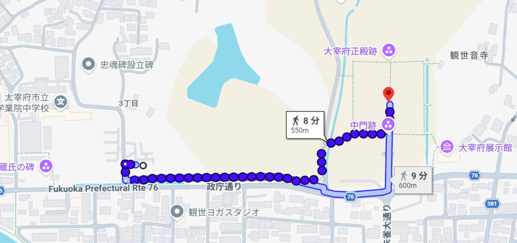 政庁跡までは5分ほど歩きますが、道沿いの桜もきれいなのでお花見を楽しみながら歩けます。