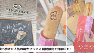 太宰府天満宮参道にある「やまや 太宰府店」を紹介。明太子で有名なやまやの明太フランスは食べ歩きに大人気!期間限定の合格印入りや、チーズ・バジル味、スムージーなども楽しめます。