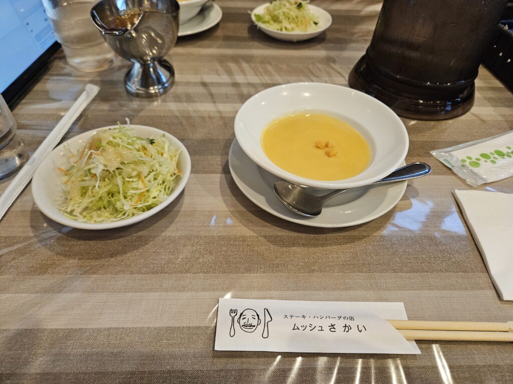今回は洋食セットにしたので、コーンスープとサラダが先にきました。