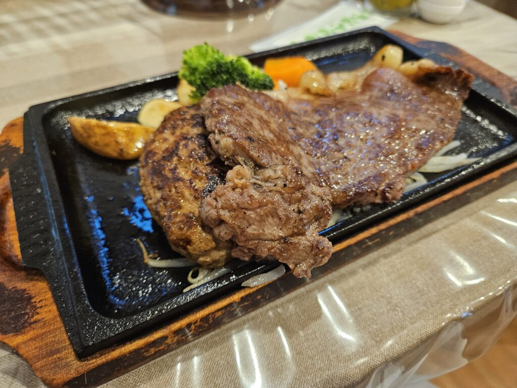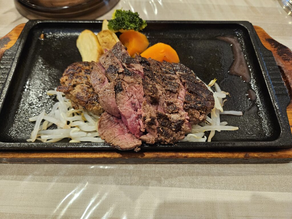 夫が注文した黒毛和牛サーロインステーキは、脂身が多めでとても柔らかく、口の中でとろけるような食感。